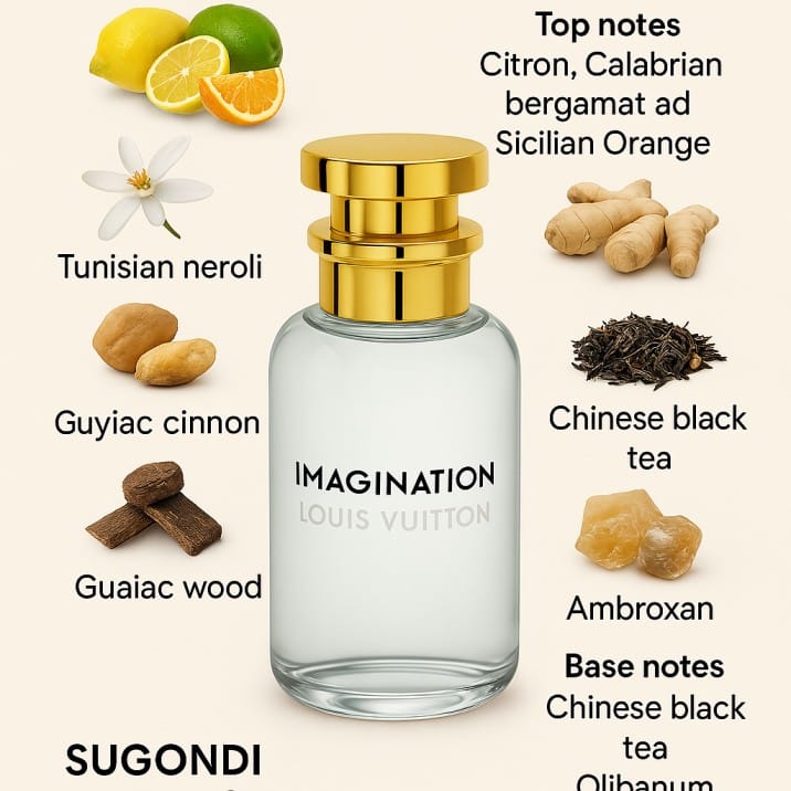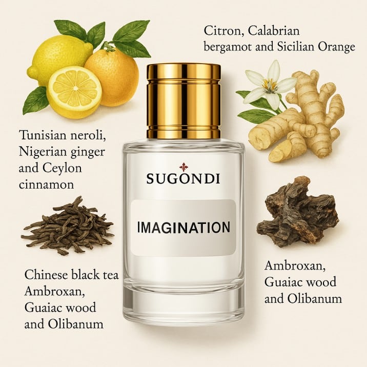 Imagination by SUGONDI — এটি এক আধুনিক, সতেজ ও রিফ্রেশিং আতর, যা Louis Vuitton-এর জনপ্রিয় “Imagination” ঘ্রাণ থেকে অনুপ্রাণিত। এই আতরের প্রথম স্প্রেতেই পাওয়া যায় সিট্রন, ক্যালাব্রিয়ান বার্গামট এবং সিসিলিয়ান কমলার ঝকঝকে সাইট্রাসি ফ্রেশনেস।
