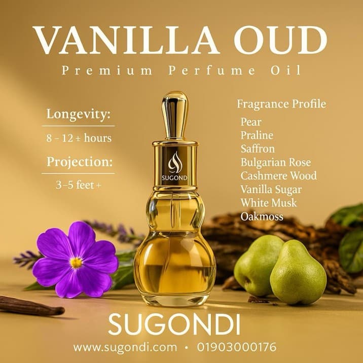 SUGONDI Vanilla Oud একটি বিলাসবহুল ও দীর্ঘস্থায়ী আতর যা মিষ্টি ভ্যানিলার কোমলতা এবং উদের গভীর রাজকীয় সুবাসের নিখুঁত সমন্বয়।