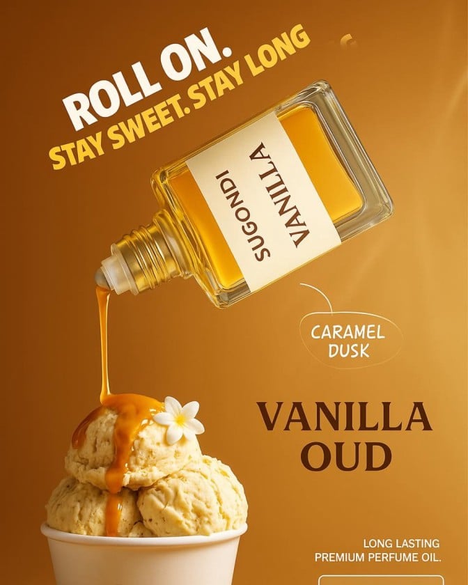 ভ্যানিলার মিষ্টি কোমলতা আর উদের আভিজাত্য — একসাথে মিলে তৈরি হয়েছে SUGONDI-এর প্রিমিয়াম Vanilla Oud আতর।